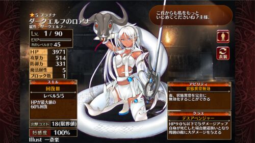 レアリティプラチナのアベンジャー、ダークエルフのロアナを覚醒しました。 アベンジャーは中コストの1ブロック近接ユニットです。 ステータスはHPが高めで、攻撃防御は1ブロックユニットとしては控えめ、攻撃速度も遅めです。 しかし、それを補うのが残りHP…